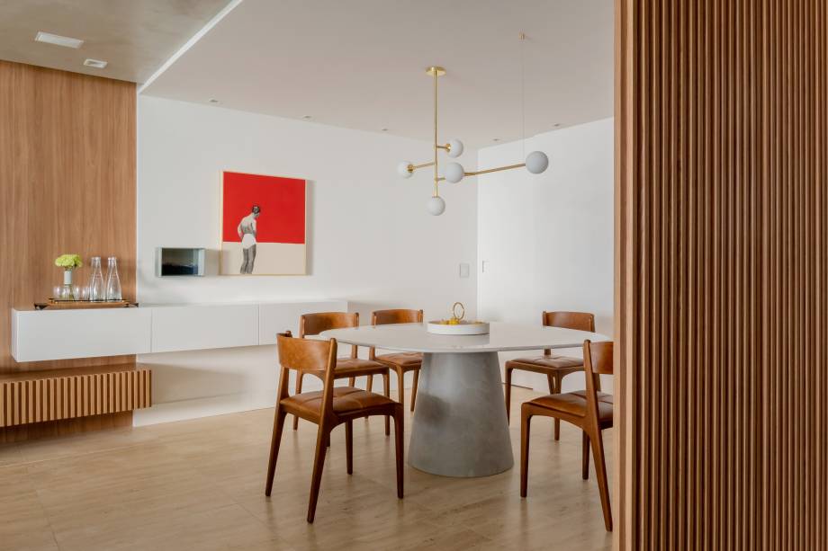 Segundo os arquitetos, a grande sala (com varanda integrada) foi dividida em estar social e sala de tv por um sofá azul, com assentos voltados para os dois lados. Já a sala de jantar é demarcada por um volume branco que contorna as paredes laterais e o teto, e abriga ainda uma grande “caixa” de madeira que delimita o hall de entrada.