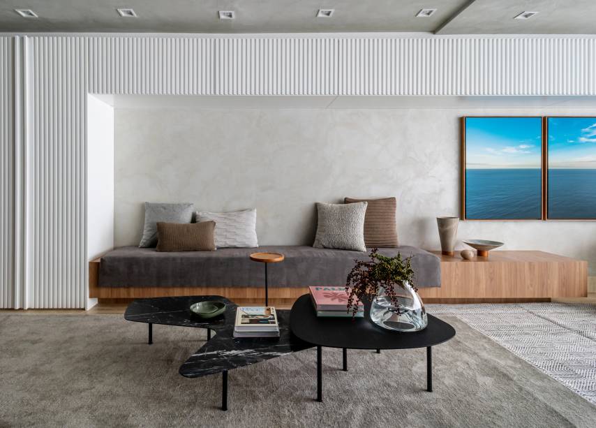 Apesar de estar localizado na quadra da praia do Leblon, o apartamento não tem vista para o mar. Por isso, o escritório apostou em uma base neutra, especialmente o branco e o cimento queimado, para destacar os móveis brasileiros de design assinado e os adornos.