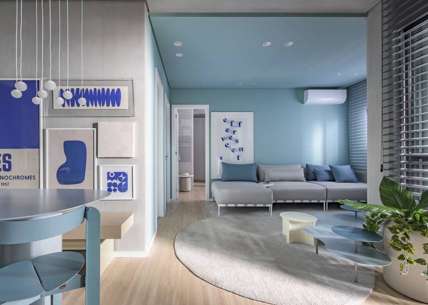 Tudo azul! Tom aparece em paredes, azulejos e arte neste apê de 74 m²