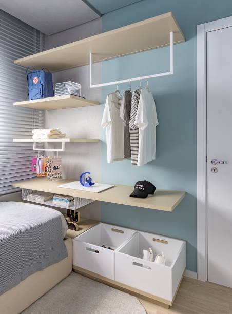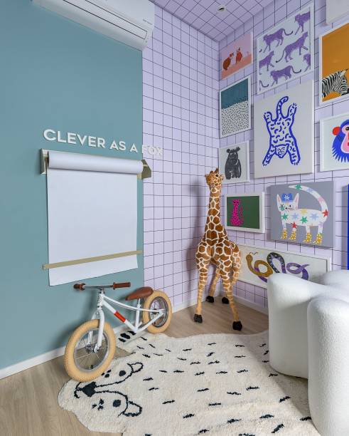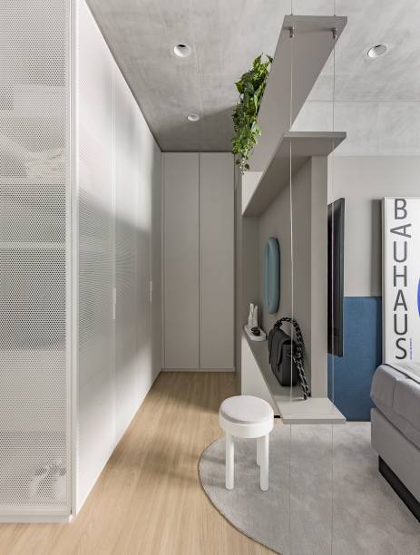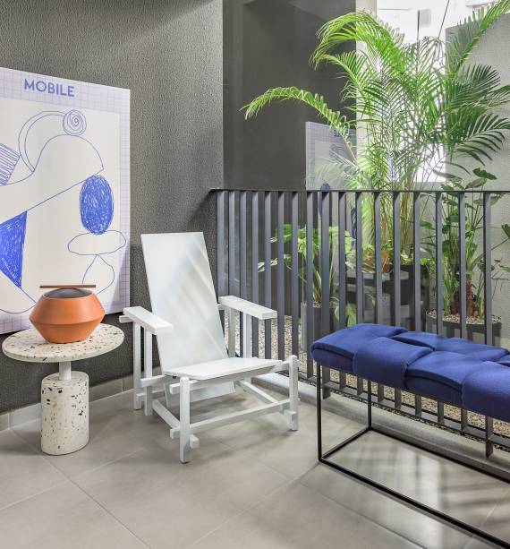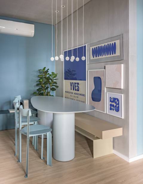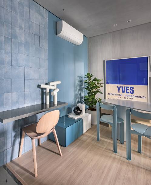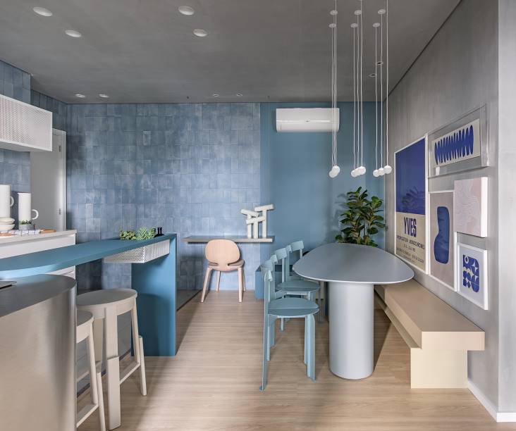Selecionadas para contrastar com o azul predominante, as peças que aparecem na forma de esculturas, quadros e gravuras nas paredes atuam como pontos focais, enriquecendo a estética urbana e contemporânea do projeto.