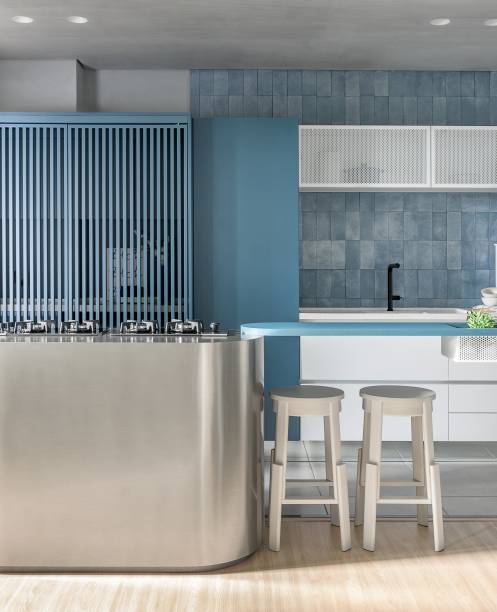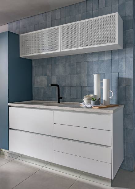 O projeto, assinado pelo escritório Bohrer Arquitetos, conta com cozinha integrada à lavanderia e área gourmet, todos em tons de azul.