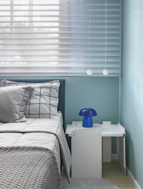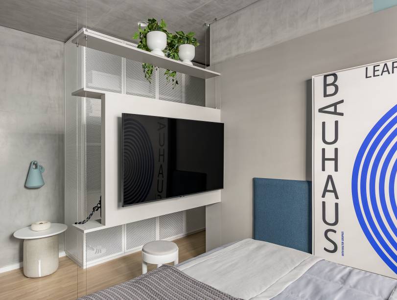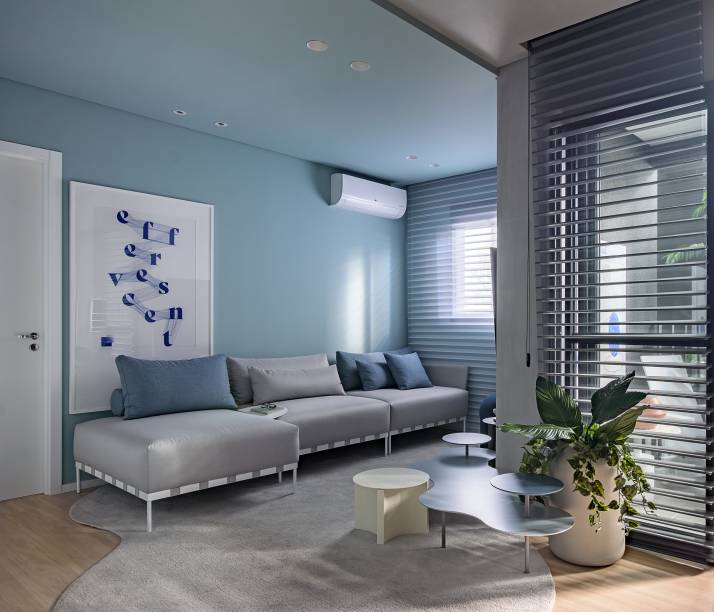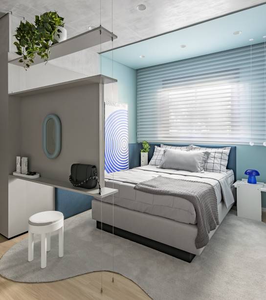 Na área íntima, a continuidade da paleta azul é suavizada e a unidade visual aparece nos detalhes: os formatos irregulares e arredondados se mantêm no mobiliário e organização do layout, assim como as obras de arte em destaque.