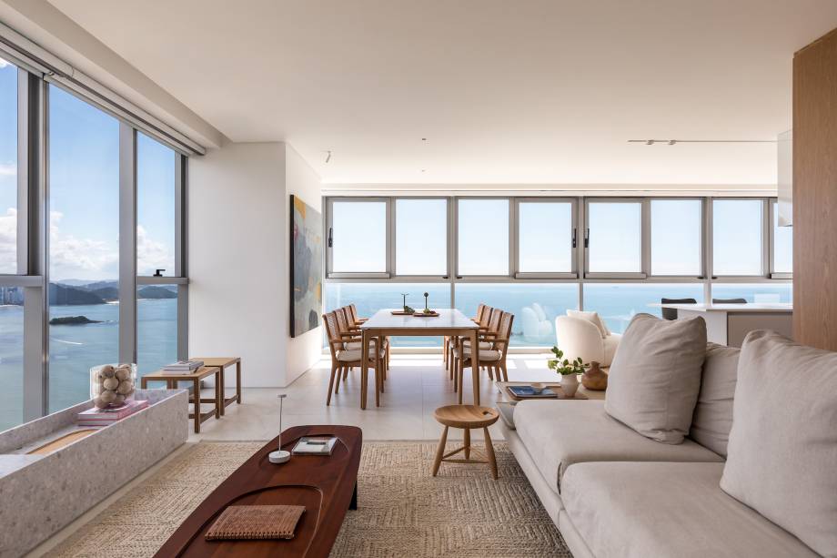 Um desafio significativo na sala foi a definição do layout, que foi redesenhado para otimizar a incrível vista panorâmica da praia que se estende por toda a Barra Sul, de Balneário Camboriú.