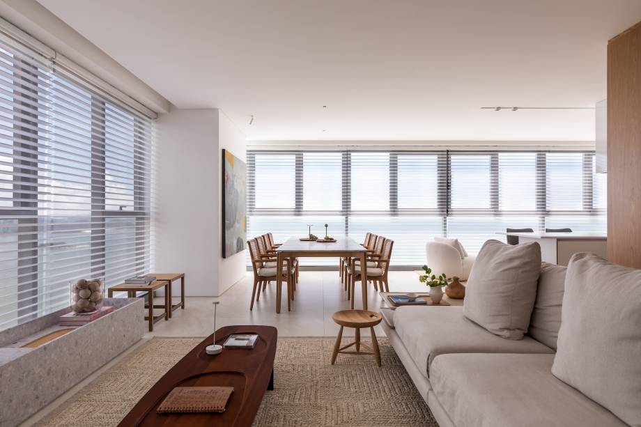 Como o prédio possui uma fachada toda em vidro, a TV foi posicionada de costas para a fachada em um trilho instalado numa base de pedra, que permite que ela corra e facilite a limpeza. O sofá foi posicionado de frente para o mar, e uma persiana blackout foi instalada para proporcionar mais conforto durante a exibição da TV.