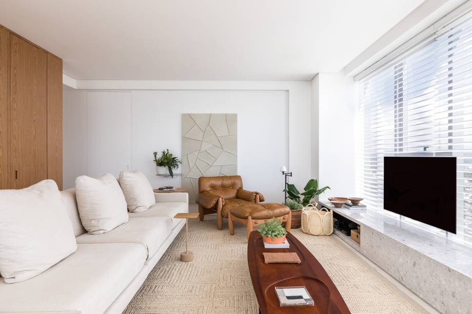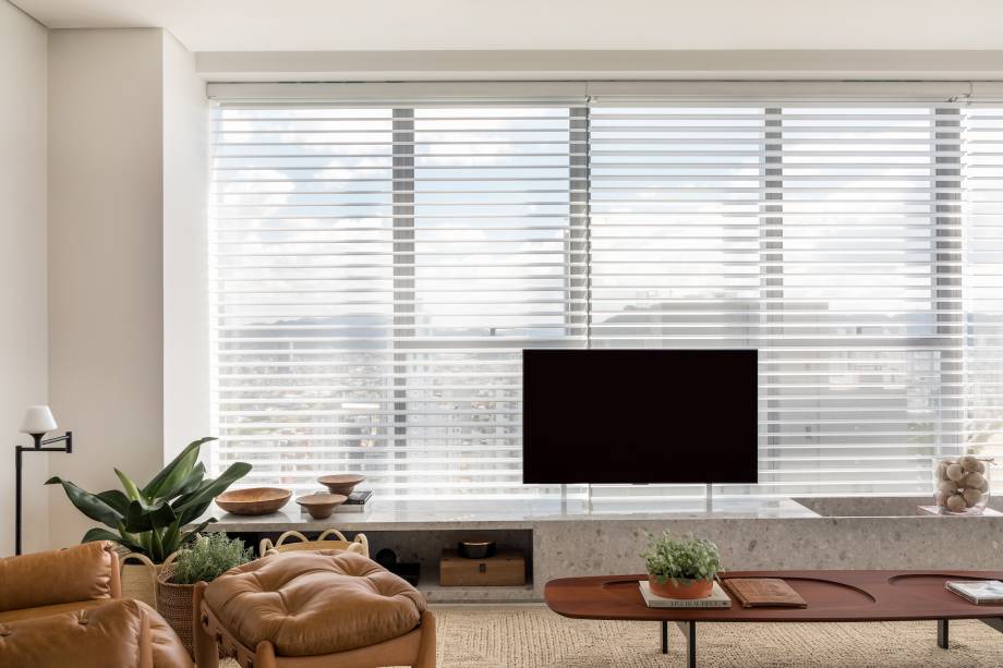 A arquiteta Simara Mello criou a solução da TV deslizante para contornar a grande quantidade de luz natural vinda das janelas.
