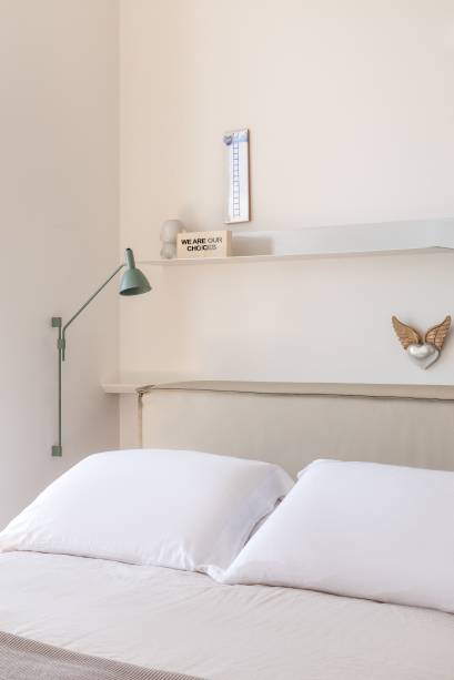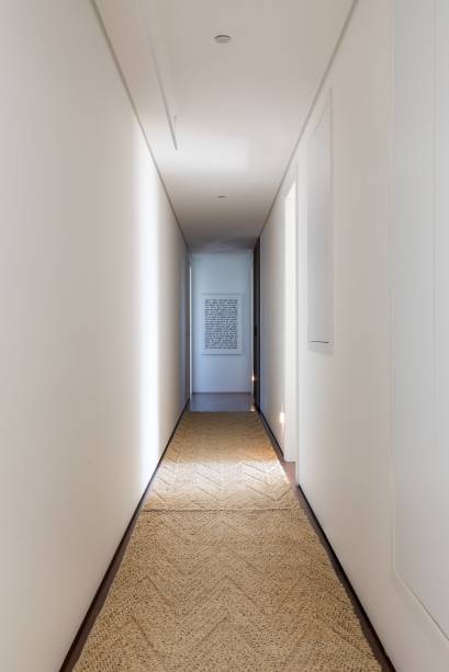 Foram instalados dois tipos de painéis em marcenaria, o primeiro, em madeira, esconde os armários que servem tanto de apoio para a cozinha quanto de disfarce para a porta do lavabo, tornando-o invisível. O segundo painel, em laca branca, camufla a porta de acesso ao corredor, que antes se destacava demais na sala.