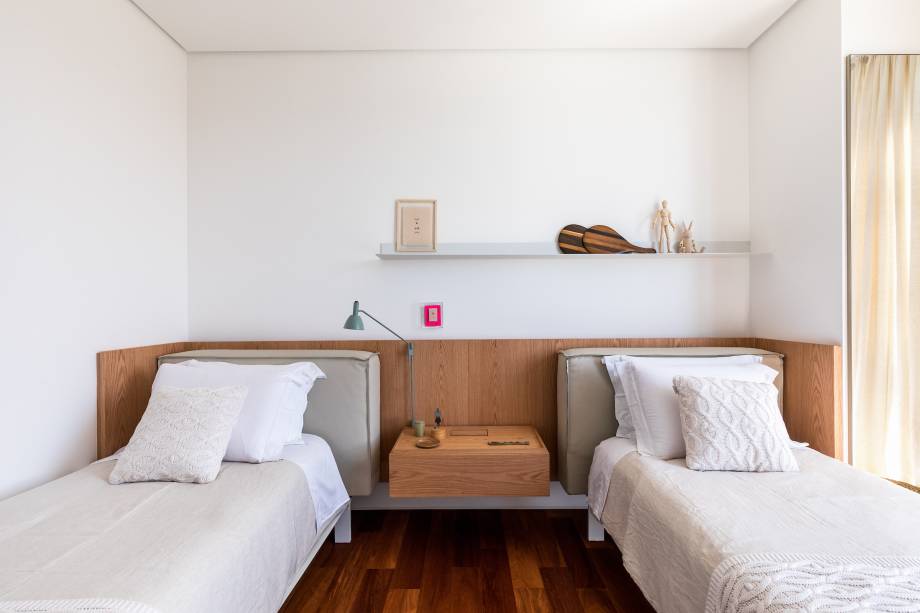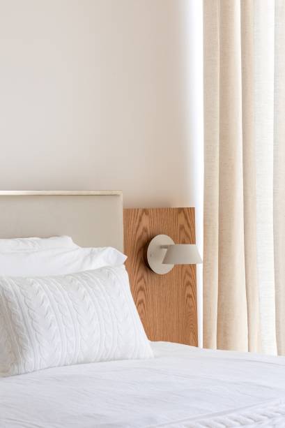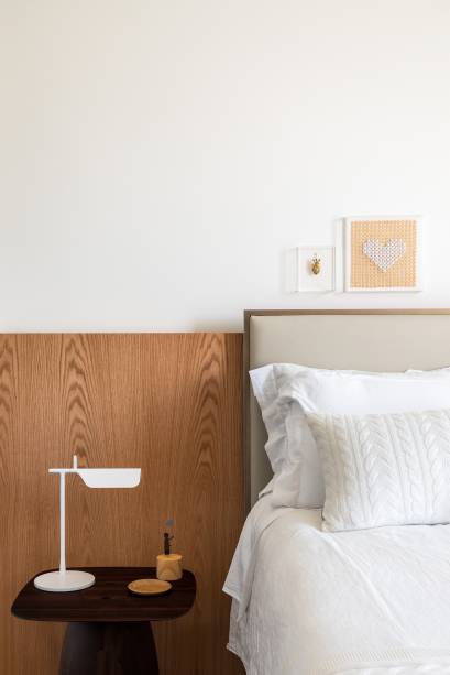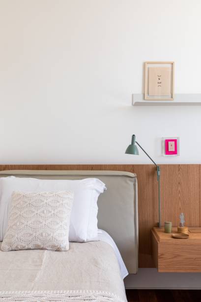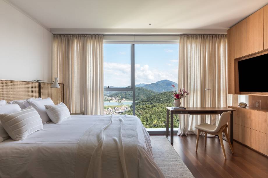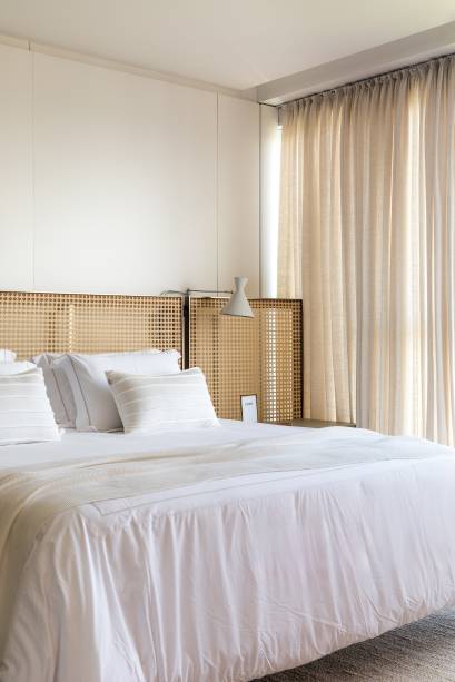 A suíte do casal, que também possui uma vista privilegiada do mar, envolve o conforto da madeira no piso e estante, com a palhinha da cabeceira, que transmite bem-estar e relaxamento.