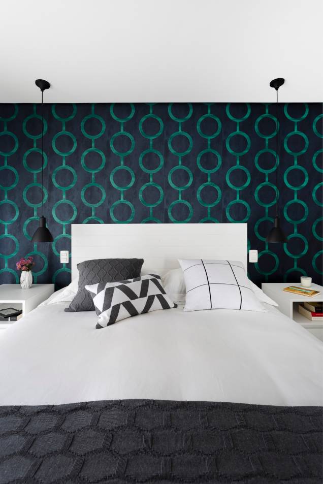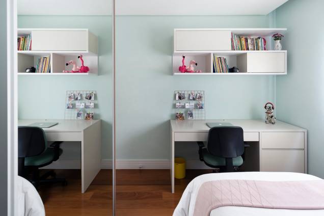 Na suíte master, o papel de parede brilha mais uma vez. Instalado na cabeceira, ele cria um painel geométrico na decoração. Já no quarto da filha, o modelo com estampa de flamingos dita a paleta de cores do restante do décor.