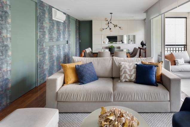 Assim, no living o grande destaque é o papel de parede que envelopa as duas sala, criando uma atmosfera acolhedora e acrescentando um toque de cor.
