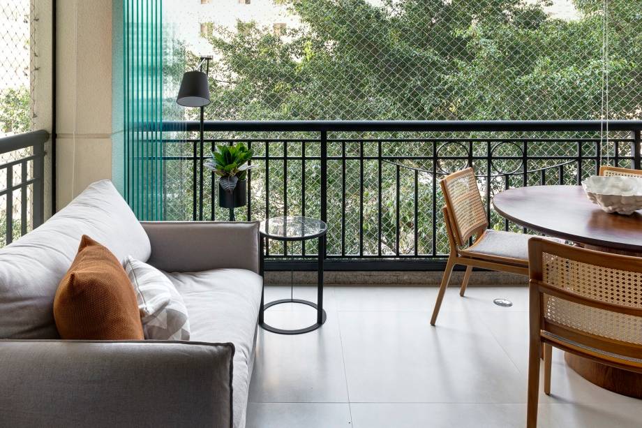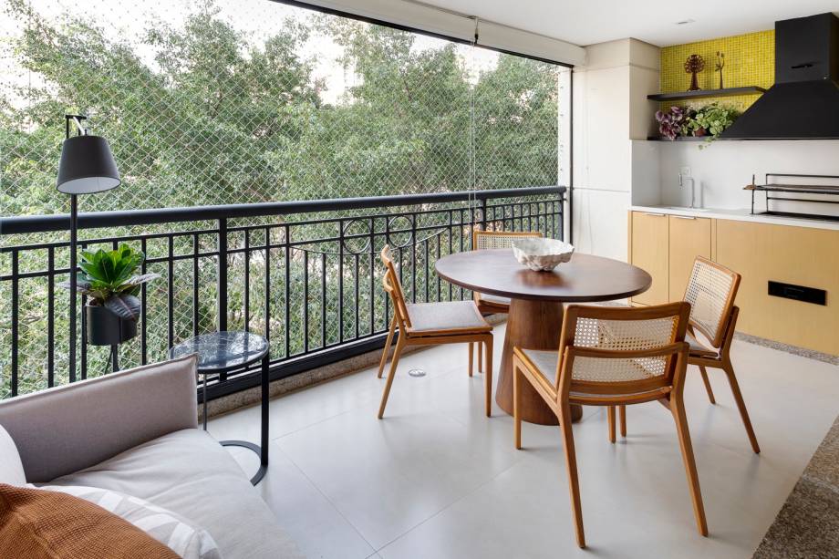 Na varanda, as cores entram para dar vida ao ambiente, como no painel de pastilhas atrás da coifa e na marcenaria. A madeira dos móveis ajuda a aquecer o espaço.