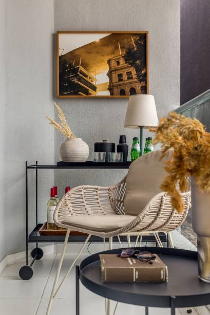 O projeto do apartamento segue um estilo urbano natural, com influências pontuais de cores mais escuras do estilo industrial e grandes forrações claras ou amadeiradas para proporcionar conforto visual.