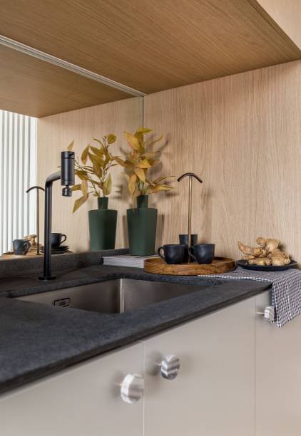 No que se refere à paleta de cores e mix de materiais da área social integrada à cozinha, o escritório elegeu a madeira carvalho em tom claro como elemento natural que permeia todo o projeto para deixar os ambientes mais aconchegantes.