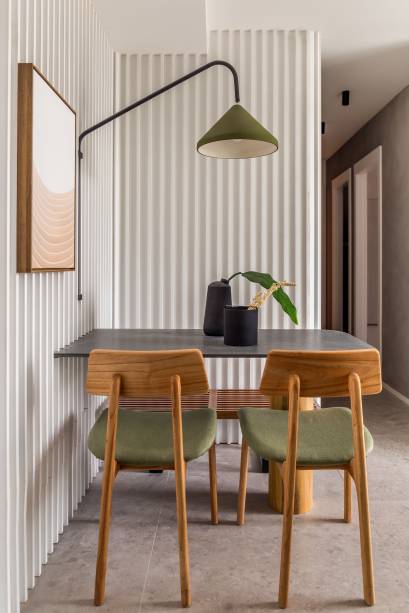 Em forma de L, o grande painel branco com ripas na vertical integra visualmente a sala e a cozinha, que ganharam ainda diversas tonalidades de cinza e verde, formando uma paleta ao mesmo tempo quente e fria, mas bem equilibrada.