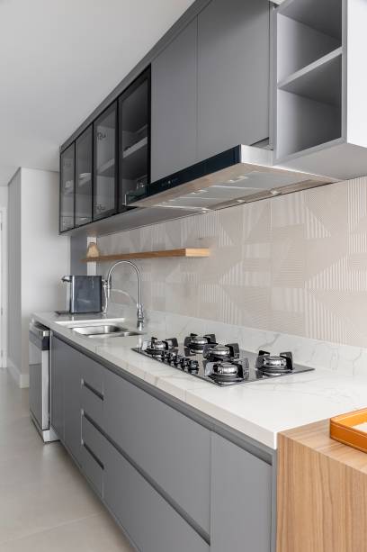 A decoração conta com uma base sóbria e neutra com elementos decorativos soltos. O desenho da marcenaria também foi feito de maneira a enaltecer o décor.