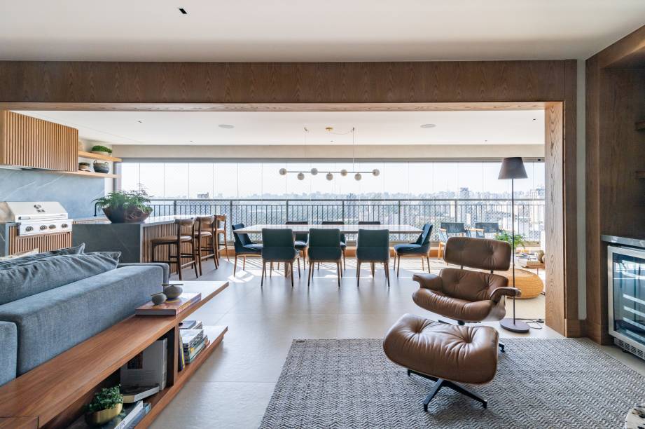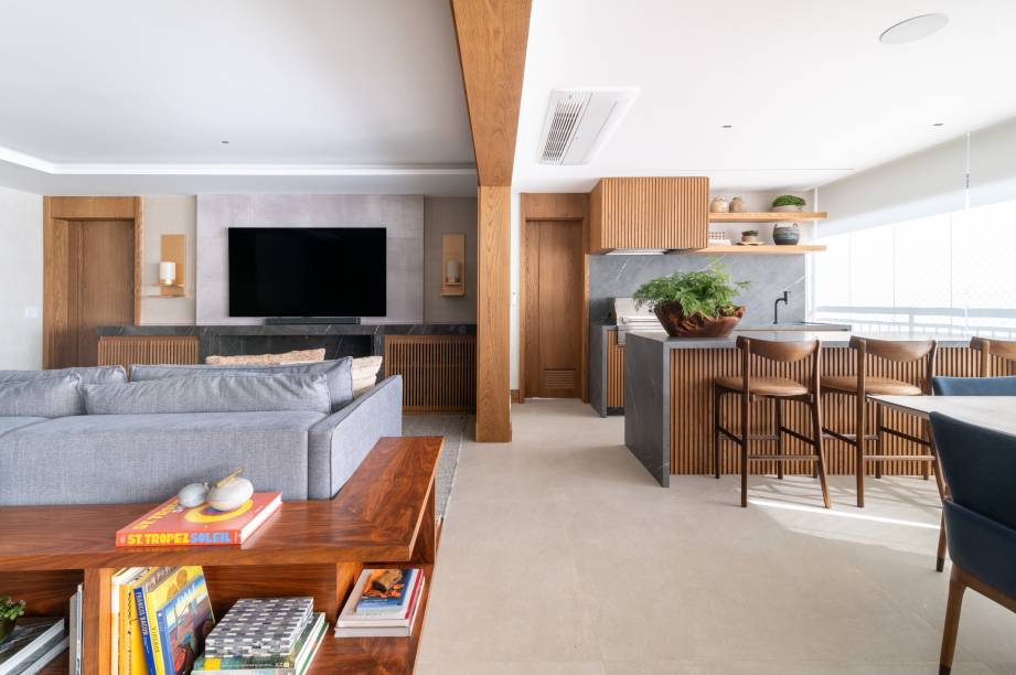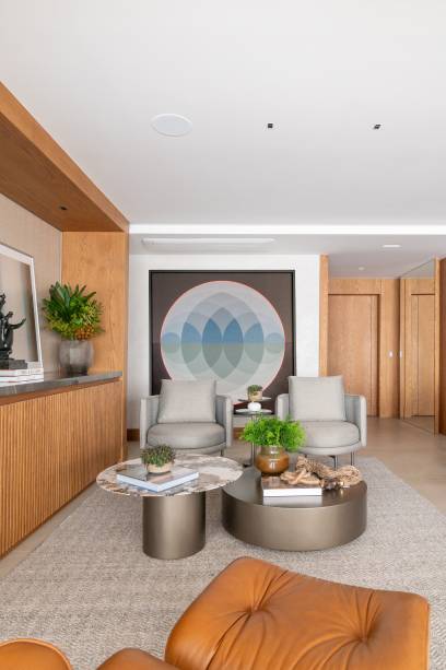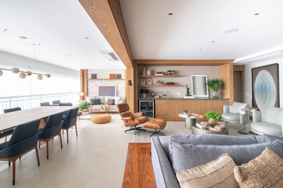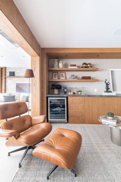 Na marcenaria do living, o grande buffet é acompanhado de prateleiras soltas, para a adega, e poltronas aconchegantes com mesas de centro para deixar o estar mais convidativo e favorecer o servir, com gavetas para utensílios e itens de uso corriqueiro. Antes da reforma capitaneada por Andrea e sua equipe, a sala era fechada e segmentada, limitando a interação com o restante do apartamento.