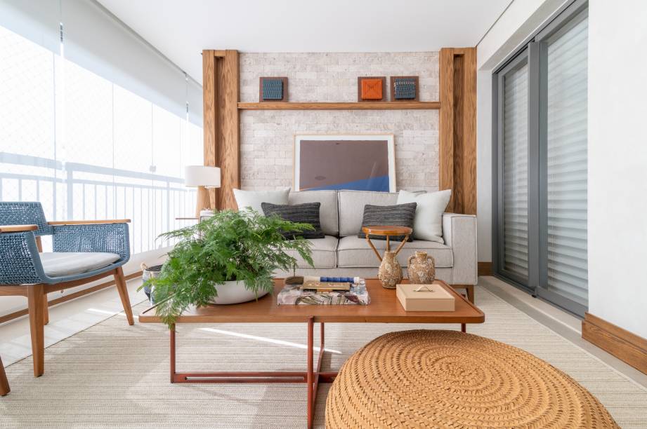 Na varanda, os materiais naturais foram os elencados. “Escolhi a madeira para estar presente no mobiliário e nos acabamentos, harmonizando com os tons neutros e os elementos naturais, como o verde das plantas e as fibras dos acessórios”, detalha Andrea Teixeira sobre o moodboard empregado no espaço.
