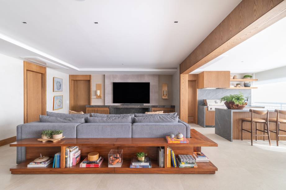 Para suavizar as costas do sofá, que divide os ambientes no estar, Andrea desenhou um móvel sob medida: um apoiador multifuncional que serve como estante para livros e também objetos decorativos, como esculturas e vasinhos de plantas. O resultado deixou o ambiente com mais uma possibilidade de apoio e também delimitou bem os setores da área de convívio.