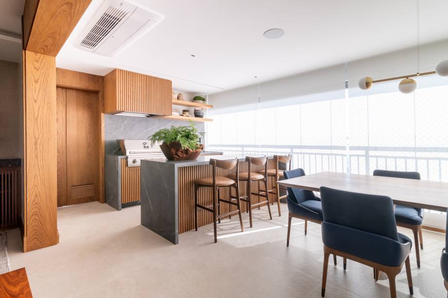 O cantinho reservado para o gourmet, ganhou uma compartimentação completa para cada um dos equipamentos: uma churrasqueira a gás no estilo barbecue americano, ideal para quem gosta de praticidade na hora de cozinhar e receber amigos; um exaustor acoplado na marcenaria superior; bancada ampla com pia e uma ilha com cadeiras altas para as refeições.
