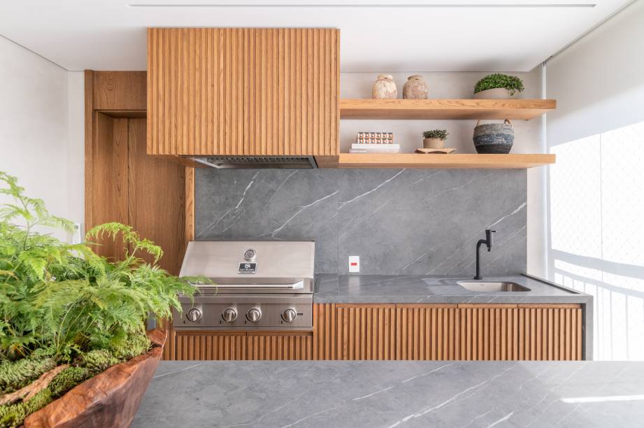 Varanda gourmet com churrasqueira a gás é destaque em apartamento