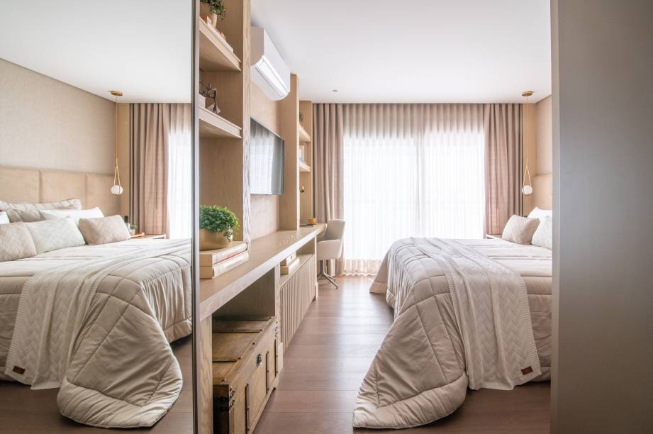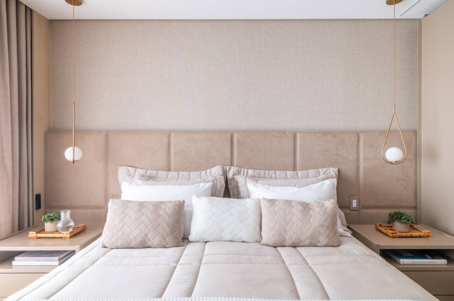 Com o objetivo de criar um espaço que abraçasse e acolhesse os moradores, a profissional optou por uma paleta suave e uma marcenaria de carvalho clareado. “A cabeceira de camurça, combinada com a palha de seda, adiciona uma elegância natural ao dormitório”, observa Andrea sobre a parede que recebe a cama.