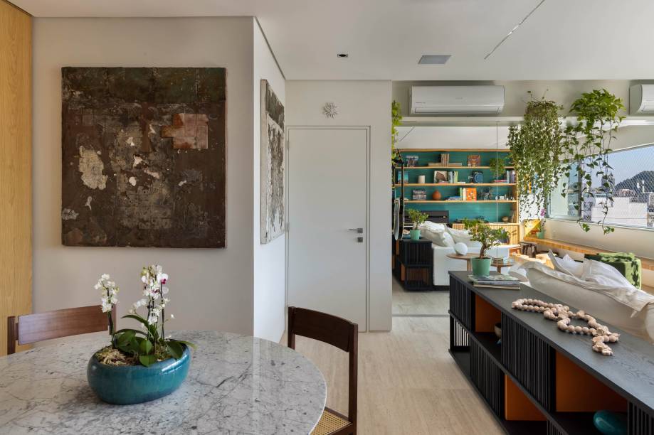 “É nosso segundo imóvel juntos e sempre priorizamos a beleza, a luz, a claridade, a ventilação, o verde, os detalhes, o conforto, a privacidade e a ordem para deixar as coisas mais organizadas para ganharmos tempo”, explica Joaquim.
