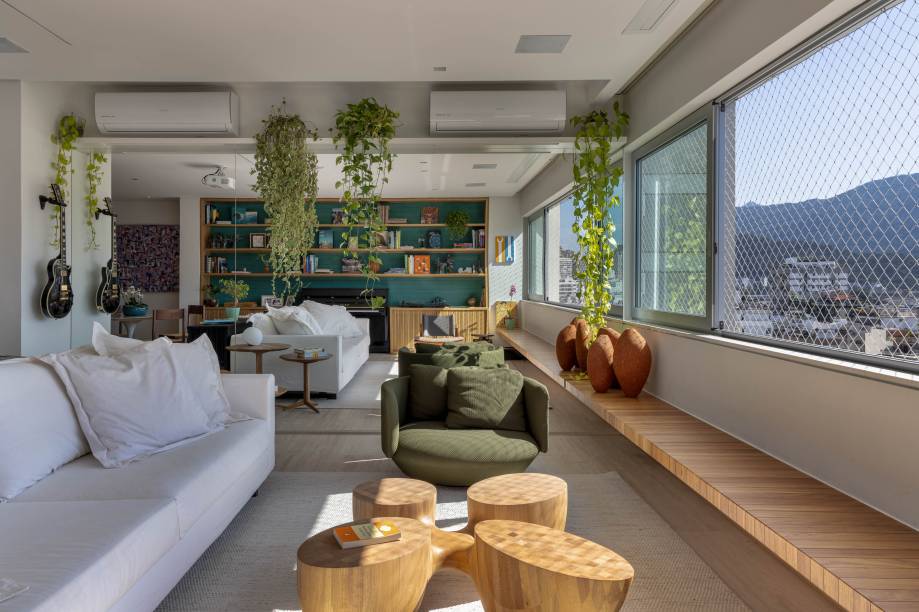 No living, um espelho que vai quase do piso ao teto duplica a paisagem e sobre ele foi colocada uma prateleira estreita para arrematar com os splits e para apoiar as plantas, combinando assim com o verde do entorno. A vontade de ter um sofá de frente para a vista fez com que um grande banco flutuante de freijó encontrasse seu lugar ao longo do janelão.