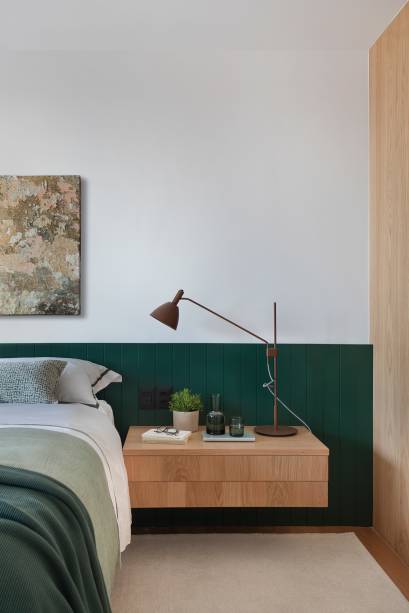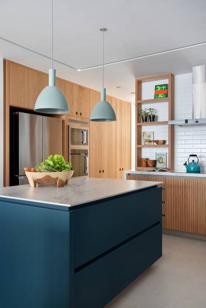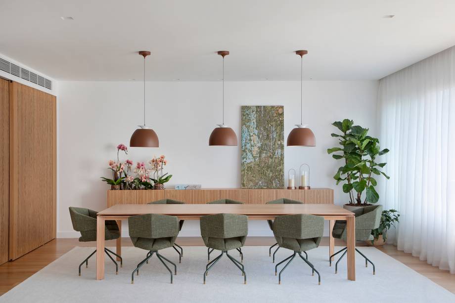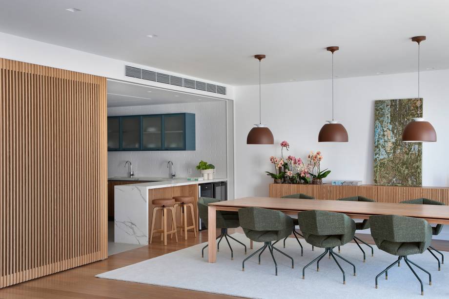 A área social foi integrada em um grande espaço de 95 m²: o jantar ganhou uma grande mesa de madeira com cadeiras verdes e pode ser unido à cozinha por meio de uma porta de correr ripada com vidro. A estante vazada divide e une o estar com o home theater.