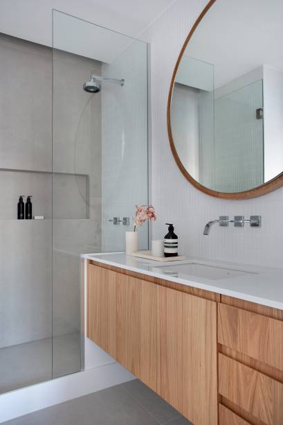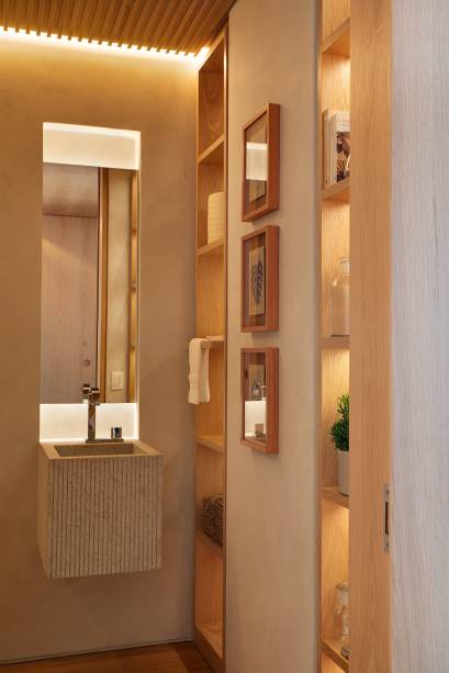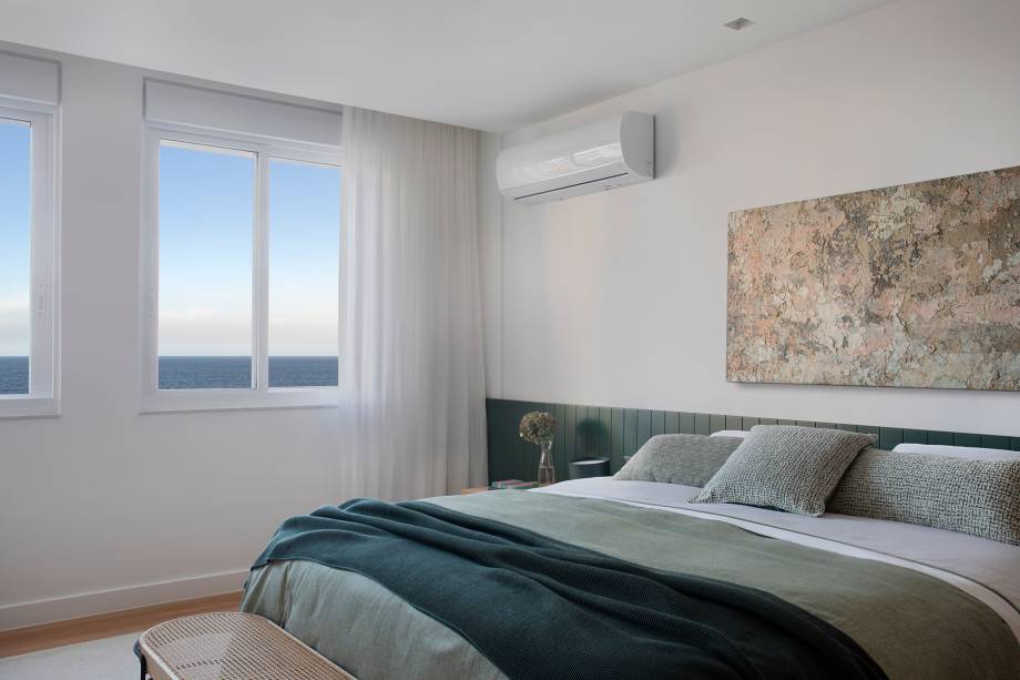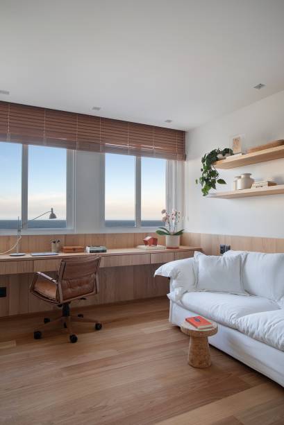 A suíte principal e o escritório possuem vista para o mar e o banheiro ganha ares de spa com deck dentro da área molhada e paraducha com requadro de madeira.