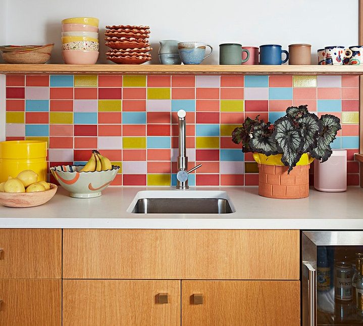 Aqui, o morador não teve medo de ousar e apostou em um revestimento bastante colorido. Para equilibrar, os outros elementos da cozinha foram escolhidos em tons neutros.