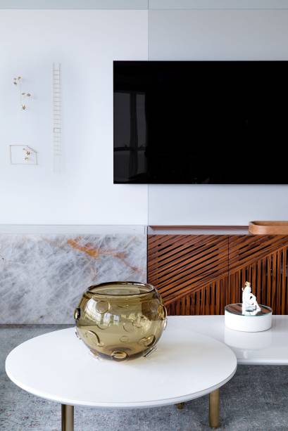 No living, foi usada a madeira pau ferro em alguns pontos estratégicos, como o home ripado e a adega. Nela, foi criado um projeto especial, para ser encaixada na parede chanfrada do apê. Outro elemento importante e destaque da sala, é a poltrona Mole, de Sergio Rodrigues, em couro caramelo.