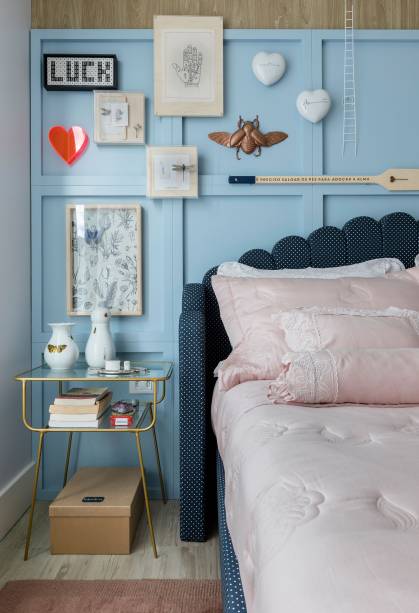Porém, o destaque vai para o quarto da adolescente. Nele, uma cabeceira azul envelopa metade da parede e recebe diversos itens decorativos e de design, que finalizam e trazem todo o charme do espaço.
