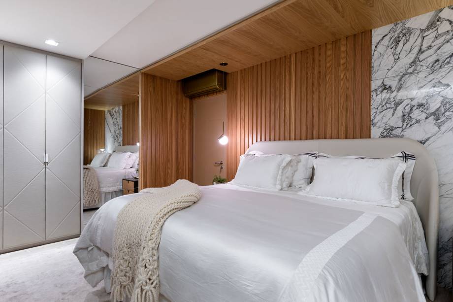 Mas não foi a madeira o único material de destaque do apê. O projeto se torna ainda mais rico com a inserção das pedras naturais. “Brincamos com a utilização das pedras de forma pontual, como no baú ao lado do home e na parede da suíte master”, explica Vanessa.