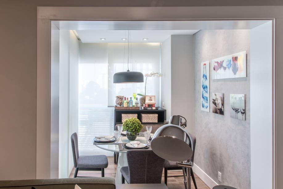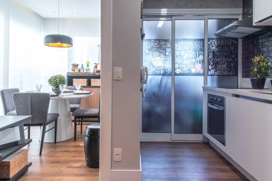 Com este objetivo, a solução encontrada foi derrubar a porta que separava a sala da varanda. No novo layout, foram integradas a sala de jantar, de estar, cozinha e varanda, enquanto alguns móveis ganharam múltiplas funções.