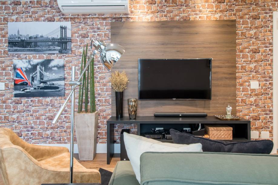 Mas o verdadeiro destaque do projeto fica para a escolha do revestimento das paredes. O cimento queimado, que dá um ar industrial ao apartamento, e os tijolinhos aparentes simulados na sala e na cozinha são detalhes que fazem toda a diferença no décor do lar.