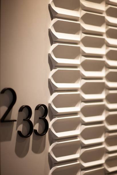 “Uma mudança bem atípica no apartamento foi a mudança do corredor para a área a intima dos quartos com o terceiro quarto”, diz Paula. “Esta área foi completamente isolada, voltando sua entrada para o lado oposto do lavabo, criando assim uma sala íntima/office”.