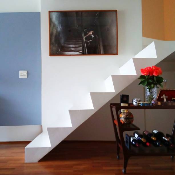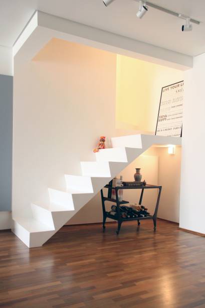 Outro artifício utilizado foi invadir o vazio da escada com os armários, ganhando área e também formando elementos suspensos e esteticamente curiosos.