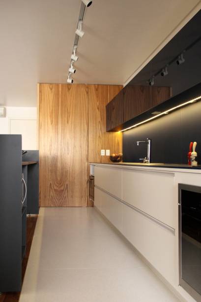 “Criada essa espacialidade, inserimos novos elementos de composição, como os móveis de aço que são usados em ambos os lados, em ‘frente e verso’, ou os de madeira, que por meio das suas linhas horizontais interligam visualmente os ambientes”, contam os arquitetos.