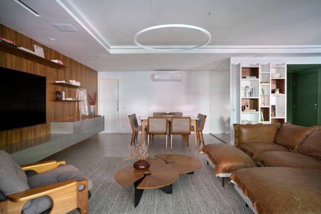 Além disso, a sala íntima foi integrada à área social do apartamento, ampliando o local de convivência – que passou a ter três ambientes: sala de estar, jantar e home theater. A nova disposição configurou uma circulação linear, que recebeu tratamentos de cores e iluminação diferentes, diminuindo assim a sensação de continuidade.