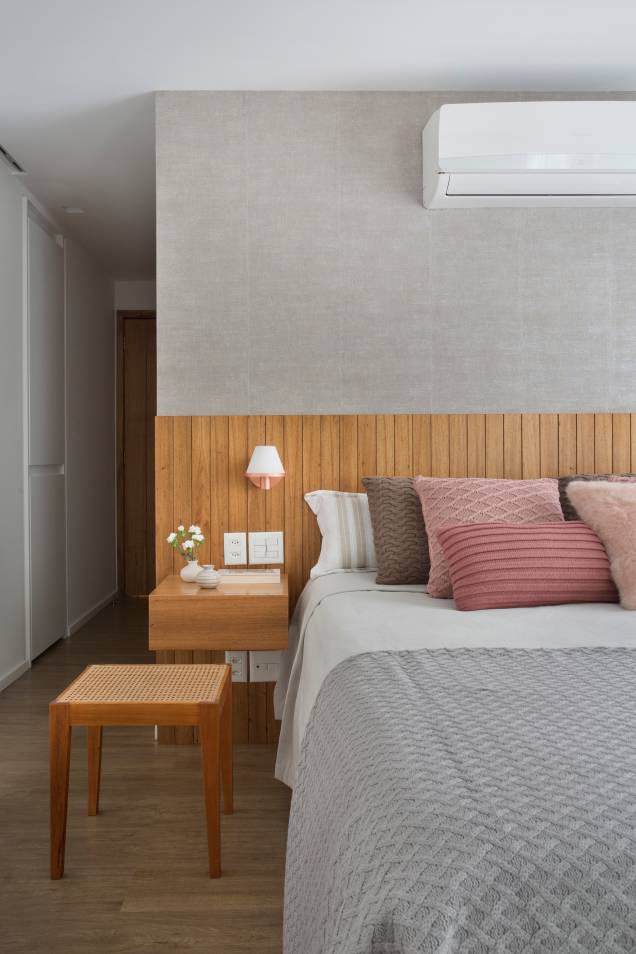 Por conta das crianças, Marise preferiu usar materiais bem resistentes, como piso vinílico com padrão amadeirado na área íntima e porcelanato com padrão cimentício para a área social, por exemplo.
