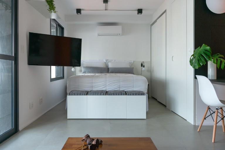 Com isto, o escritório CR2 Arquitetura, sob comando da arquiteta Clara Reynaldo, entrou em cena: propôs uma reforma que deixou o espaço o mais amplo possível, sem separação entre sala, cozinha e quarto; usou materiais resistentes, de baixa manutenção e baixo custo, caso do porcelanato no piso e da fórmica na cozinha; e uma boa iluminação, por isso a predominância do branco nas paredes e no teto, do cinza claro no piso e do guarda-roupa e cabeceira brancas.