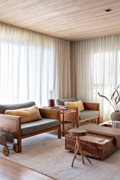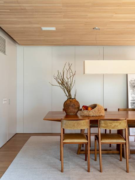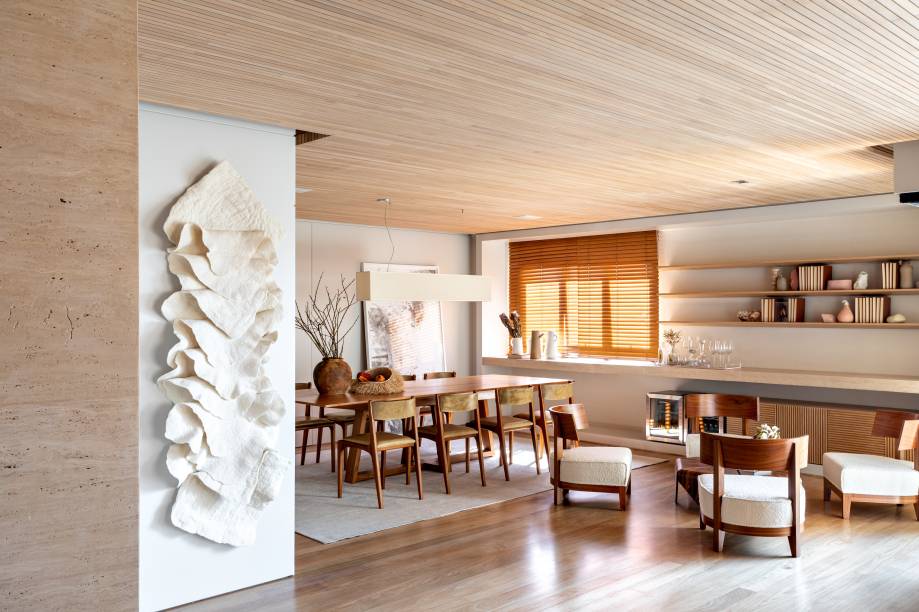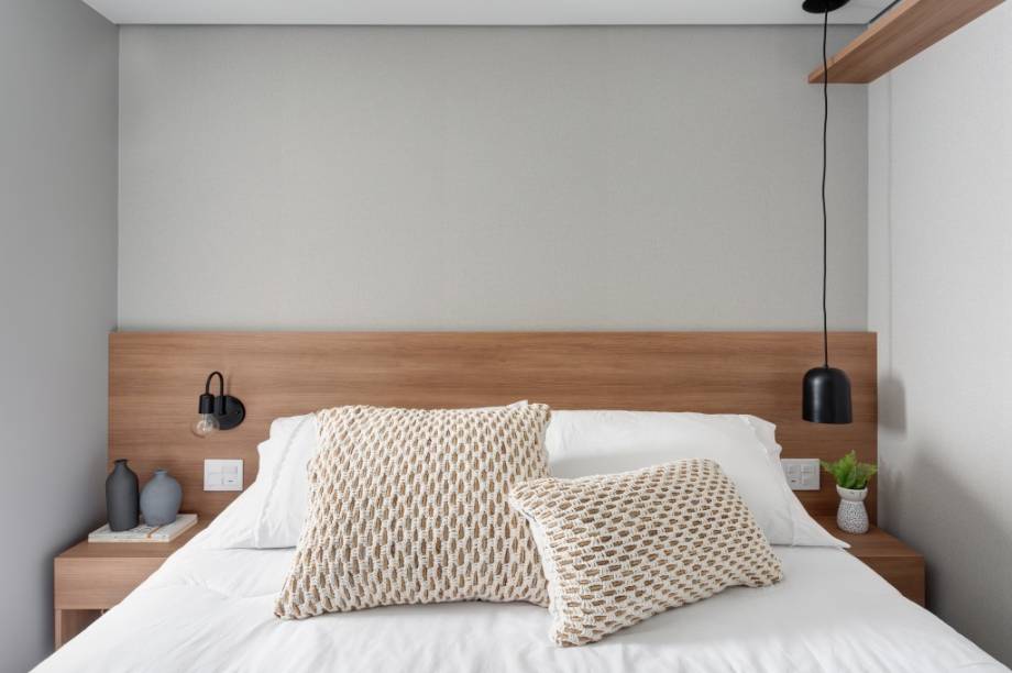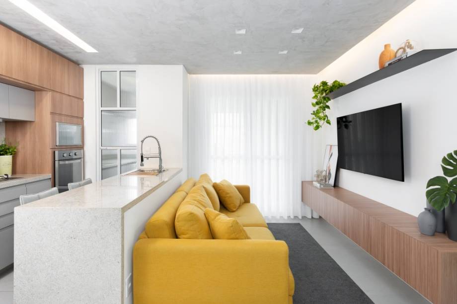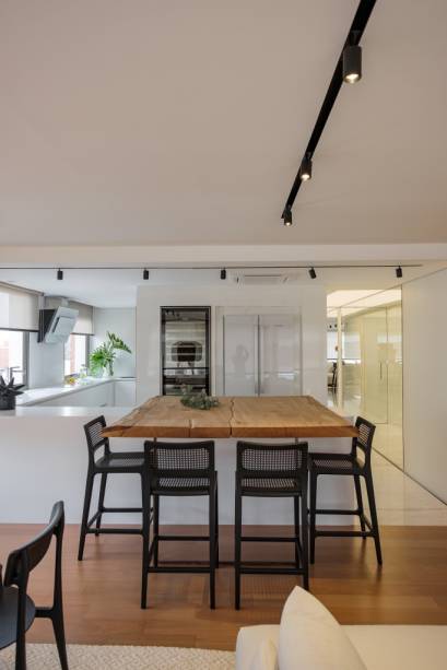 O uso de madeira em painéis, móveis e até no piso, pode ser muito interessante para quebrar completamente o estático dos ambientes brancos. A madeira também é responsável por trazer conforto e casa muito bem com qualquer ambiente.