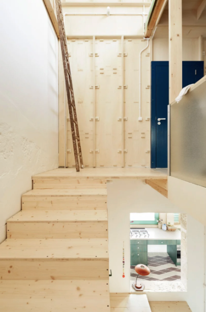 Na Plywood House, como ponto de partida, os arquitetos construíram uma base autônoma feita de painéis de madeira compensada de álamo de 244 × 122 cm – elementos que eles também combinaram na construção do novo piso.