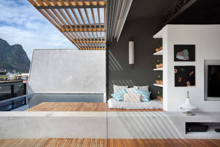 “O deck com passarela e o banco de cimento, que entra no living até compor o rack, criam uma unidade visual entre os ambientes internos e externos”, conta Adriana.