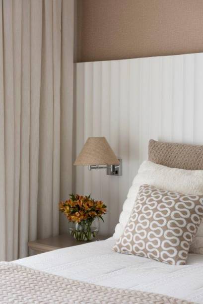 A cabeceira alta traz imponência, enquanto a iluminação direta e indireta reforça a proposta de tranquilidade do ambiente.