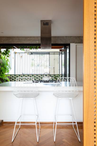 Na cozinha, uma ilha central fica entre a parte interna e a varanda. Ali, o banco de concreto marca presença mais uma vez, com a função de jardineira. Uma estampa geométrica nos ladrilhos dão o charme e a cor finais.