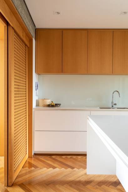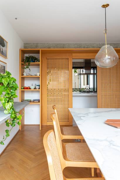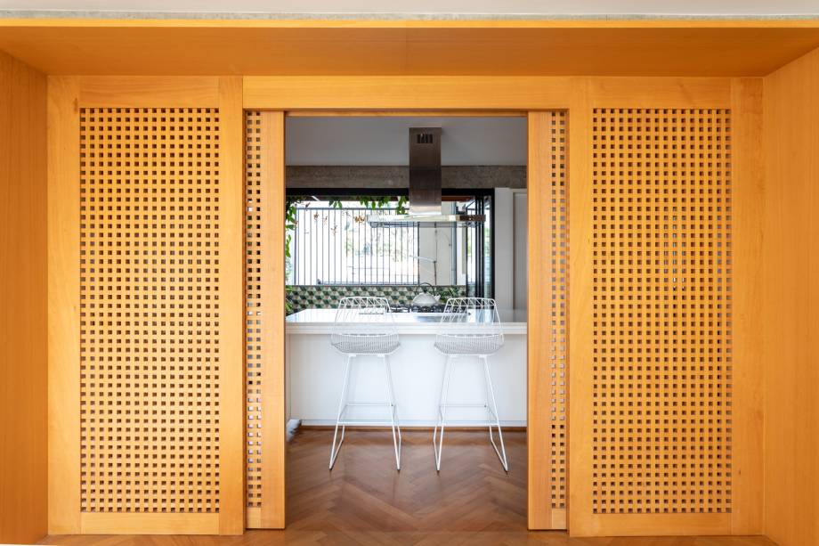O mobiliário é fundamental para criar a identidade de cada cômodo, mantendo a coesão estética. Exemplos disso são as portas de correr de muxarabi que permitem a entrada de luz natural mesmo quando estão fechadas – elas também dialogam com as cadeiras do jantar. Outro destaque é o banco de concreto, o qual oferece linearidade e emoldura a janela.