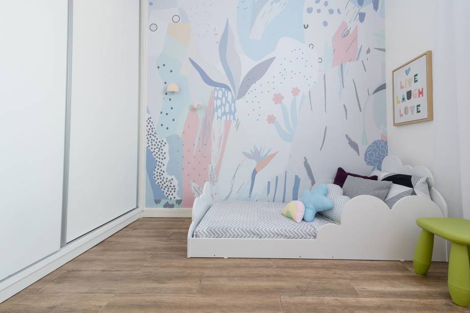 Um dos destaques do projeto é o quartinho do filho de 3 anos. O pequeno possui muita personalidade e ama cores alegres. Para isso, um quarto estilo Montessoriano foi a aposta, garantindo a autonomia da criança, com uma cama baixinha em formato de nuvem, uma cabana para curtir a leitura das historinhas que os pais contam, um tapete para manter os pés quentinhos, prateleiras para os livrinhos e claro, uma balança amarela para bagunçar muito no quarto. O charme do espaço ficou todo por conta dos adesivos vinílicos.
