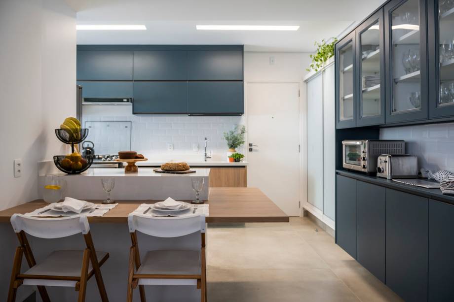 “Como a família é de origem carioca, buscou-se no projeto mesclar o clima de praia com o alto uso cotidiano, usando madeira e toques de cores claras e suaves nos moveis e na produção”, dizem. As referências ao mar – grande paixão da família – podem ser vistas, por exemplo, no azul profundo que preenche a cozinha.