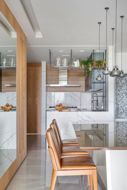 Em apê integrado, revestimentos delimitam áreas e garantem décor moderno
