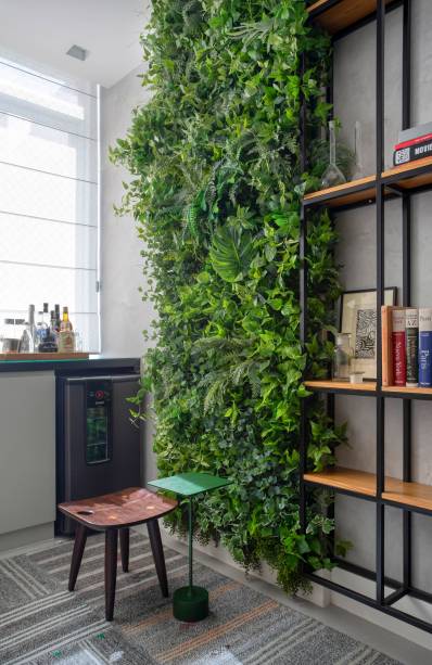 Já a varanda foi integrada ao ambiente e transformada em uma área para degustação de vinhos, com direito à parede verde, móvel-bar e estante para os livros.